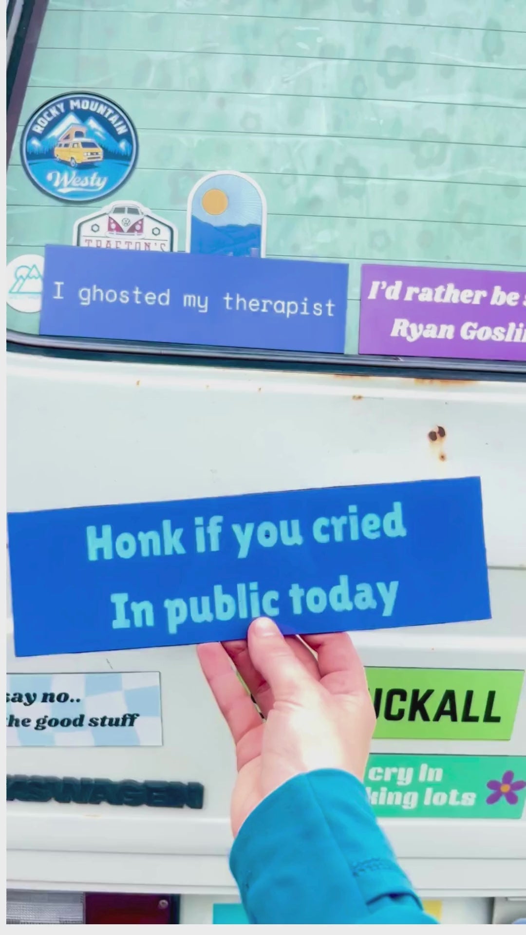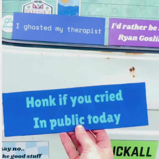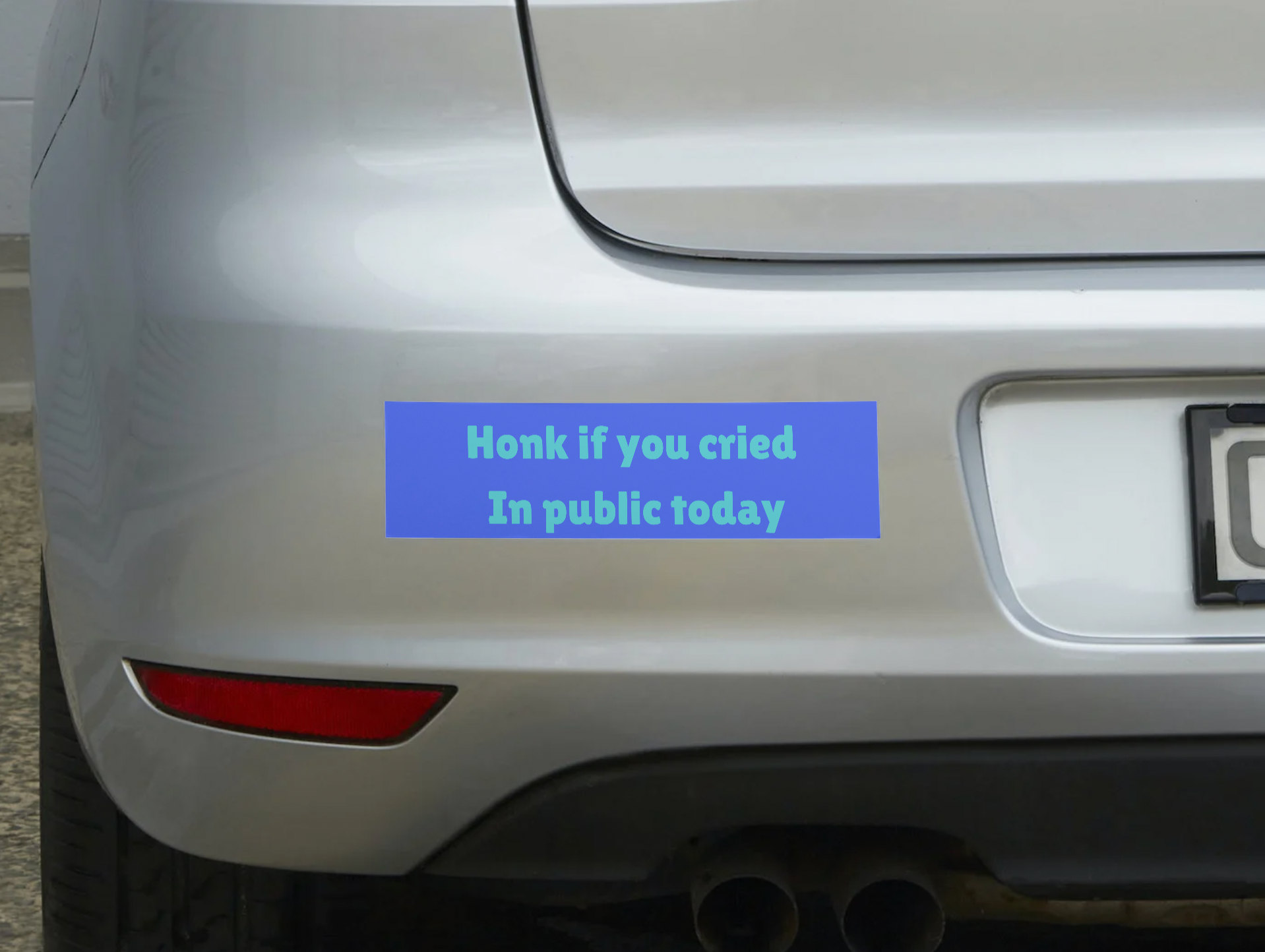 Emotional stability is a myth and the grocery store parking lot knows your tears by name. This sticker is for the beautifully unstable icons holding it together with vibes, caffeine, and a single unraveling thread. Honk loud. Honk proud. We’re not well.