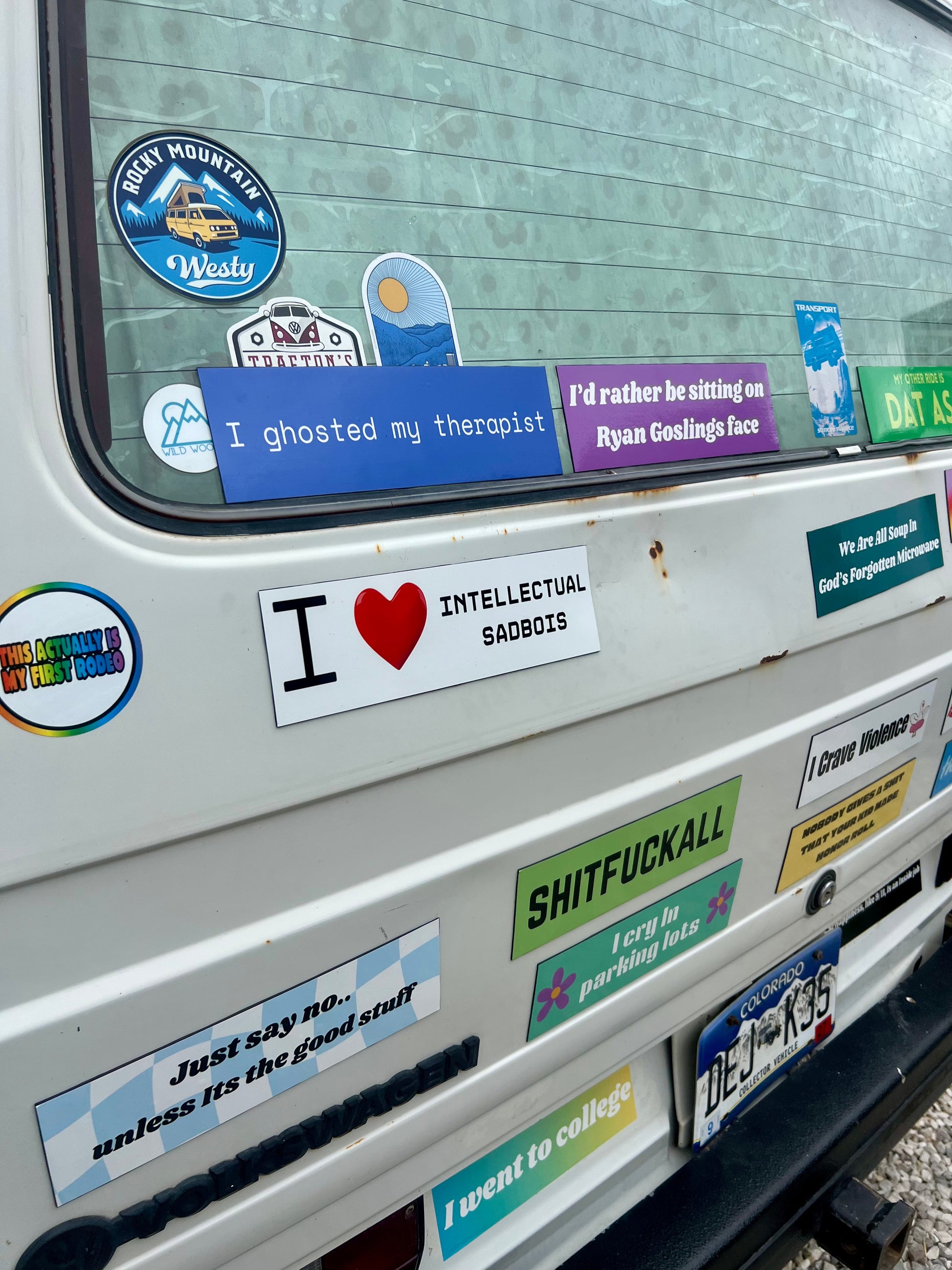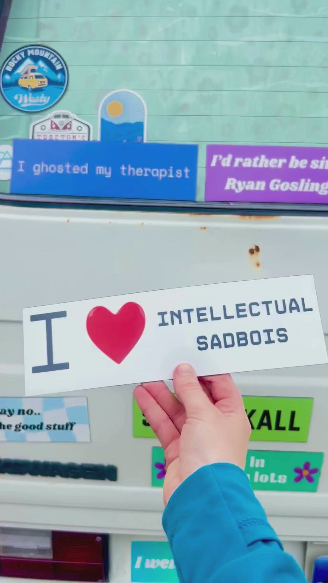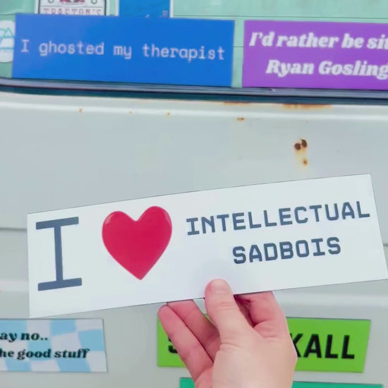 I "heart" intellectual sadbois- This sticker lets the world know you’ve got a PhD in falling for men who quote Camus, vape lavender, and write poetry about their seasonal depression. Slap it on your car, laptop, or the copy of Infinite Jest he lent you and never got back.