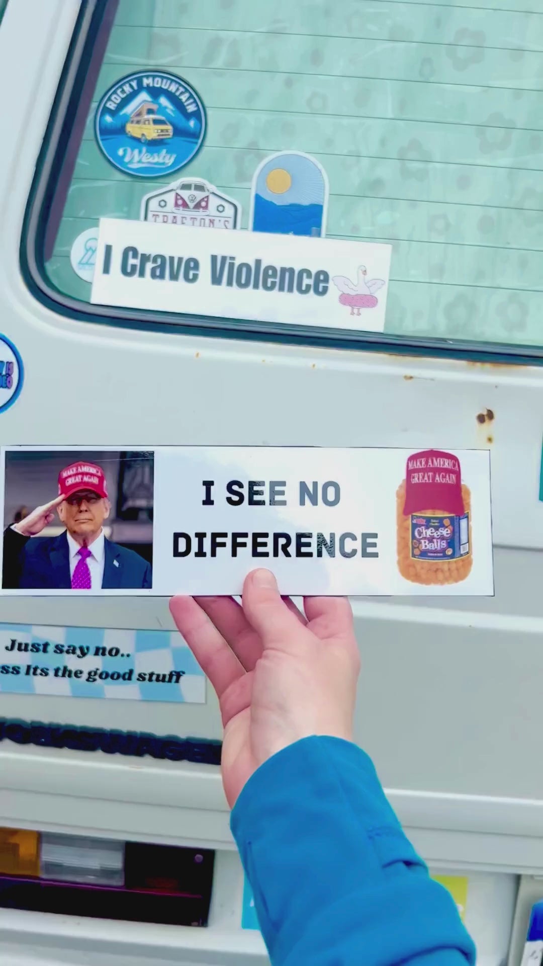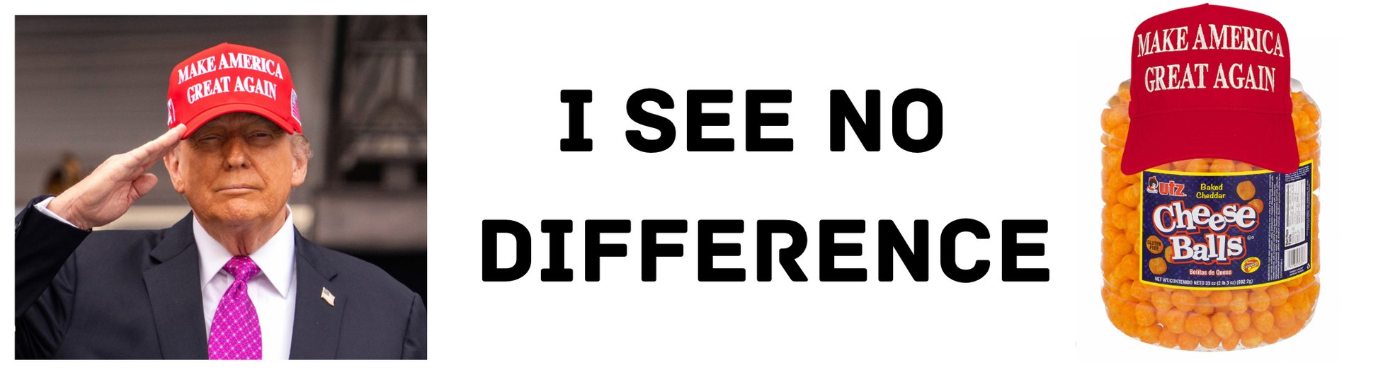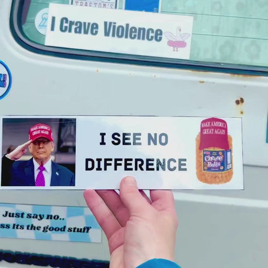 I See No Difference — Because sometimes a certain MAGA hat-wearing man and a container of cheesy puffs are basically indistinguishable. This sticker packs sharp political satire.