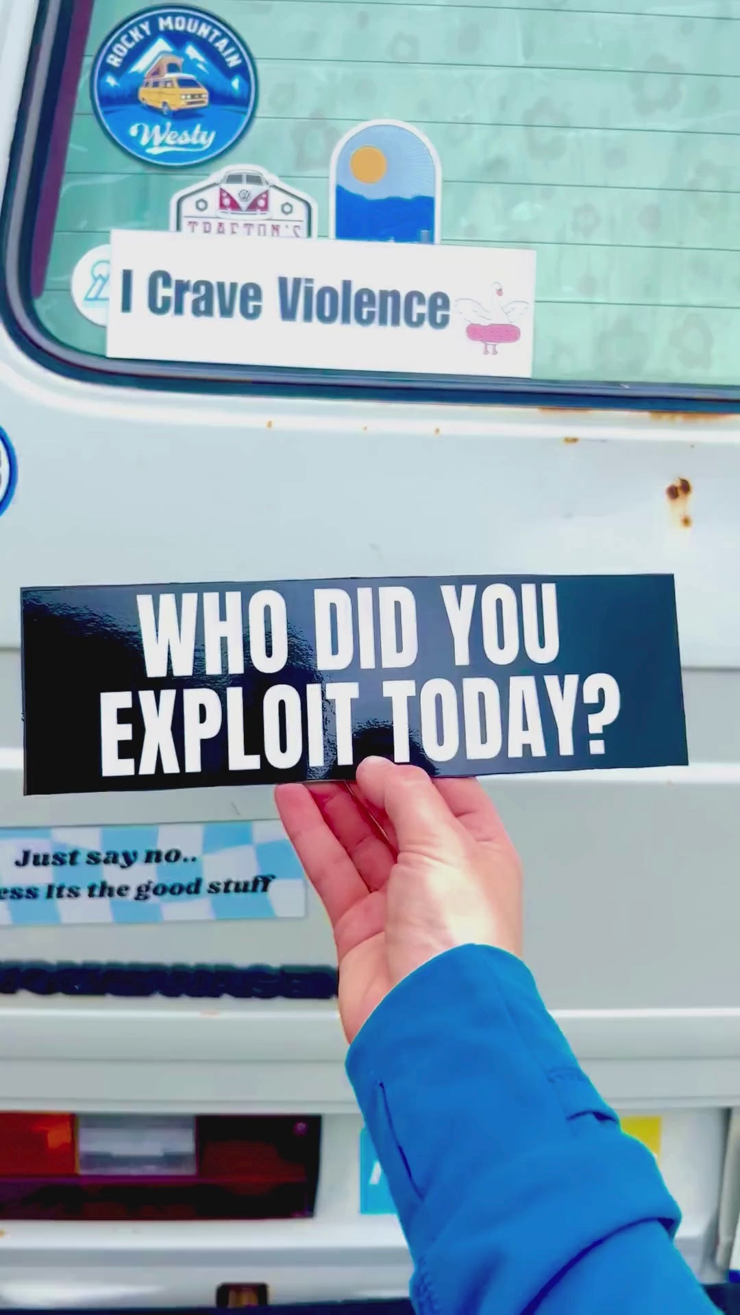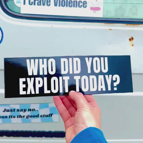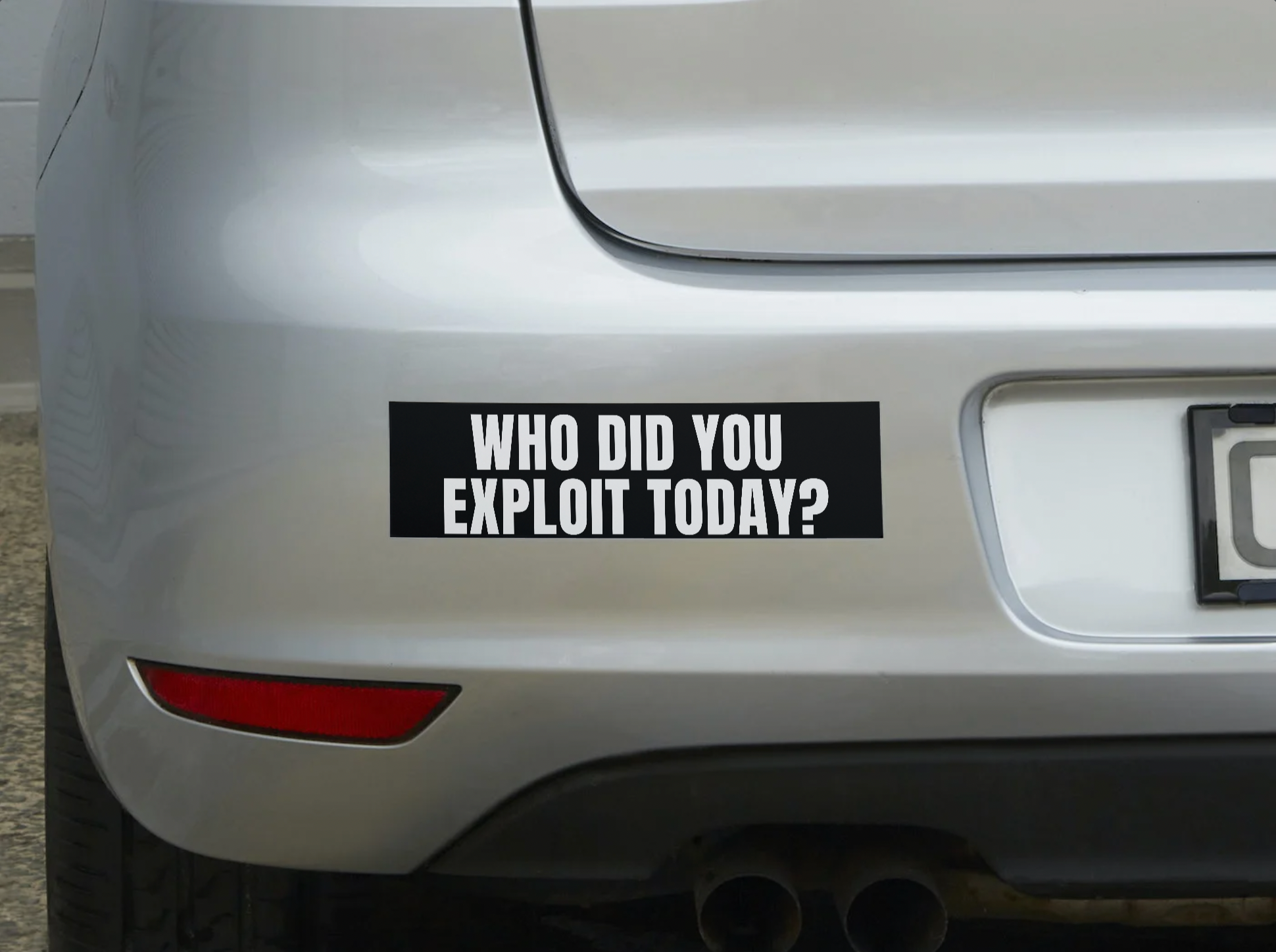 Who Did You Exploit Today? — A brutally honest reminder to check your conscience before you roll. This sticker is made to outlast your darkest sarcasm!